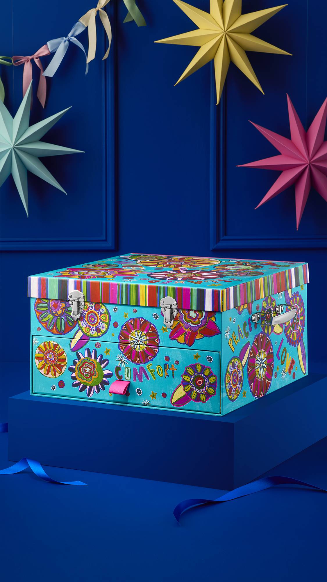 The artwork on this box was created by Shruti Gadhvi, an artist who works with Artbox. Artbox London is a registered charity and social enterprise that runs a program of art workshops to allow those with learning disabilities and neurodivergent artists to explore their creative interests and develop their artistic skills. Shruti says, “When I’m in my area in London and on holiday, I see lots of flowers and color and this gives me ideas for my art. In Artbox I found a book on meditation and combined the flowers and colors with positive words and mandalas to create this piece. The words make my mind and body feel calm and then I feel the flow inside the body when making the art.”